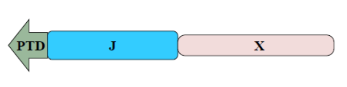 PTD-J-X:由PTD、J和X三種寡、多胜肽所組合的融合蛋白質。