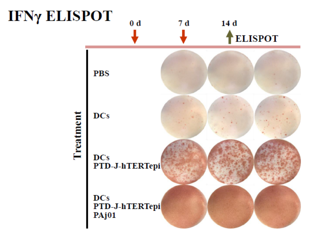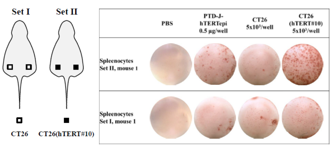 移植帶有人類hTERT基因的小鼠CT26大腸直腸癌細胞[CT26(hTERT#10)]到正常小鼠三週後,取脾臟細胞做離體培養,該脾臟細胞對CT26(hTERT#10)細胞及PTD-J-hTERTepi刺激會產生分泌IFN-γ。下圖每一個褐色點代表一個有免疫效果的細胞,點愈大表示功能愈強。
