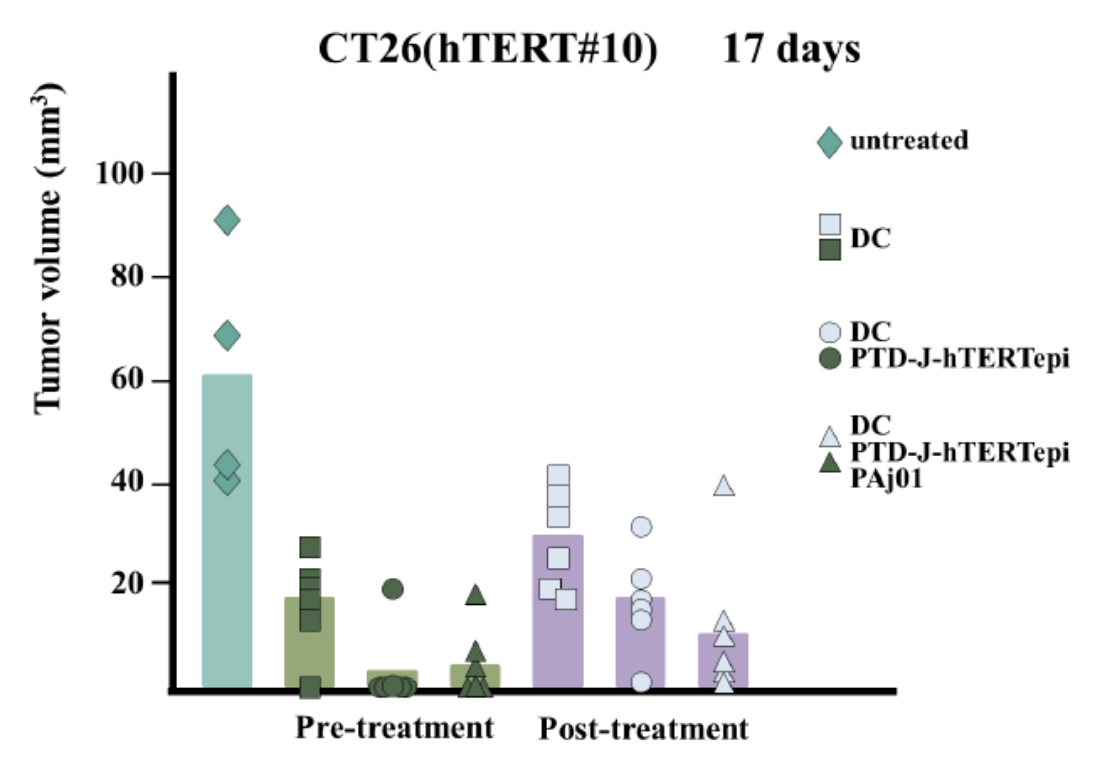 Pre-treatment組:注射CT26(hTERT)癌細胞前第9及第2天腹腔注射1,000,000個DCs或35微克PTD-J-hTERTepi wo/w 137微克PAj01;Post-treatment組:注射CT26(hTERT)癌細胞後第2及第9天腹腔注射1,000,000個DCs或35微克PTD-J-hTERTepi wo/w 137微克PAj01。皮下注射CT26(hTERT)癌細胞後第17天,測量腫瘤的大小。
