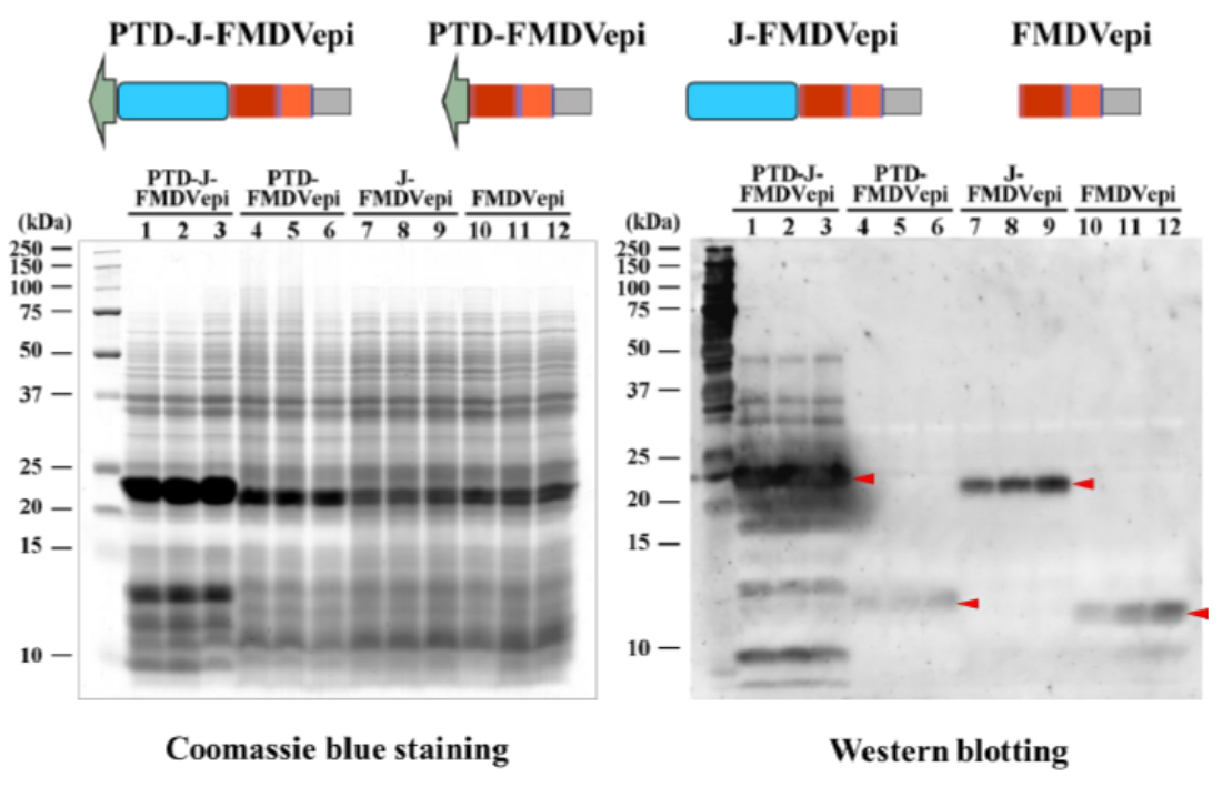 利用大腸菌生產口蹄疫抗基組合FMDVepi時,可以明顯地看出PTD-J-FMDVepi產量最高。