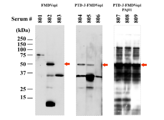 配合小鼠專用的PAj01佐劑,可以大大提高PTD-J-FMDVepi之免疫原性。